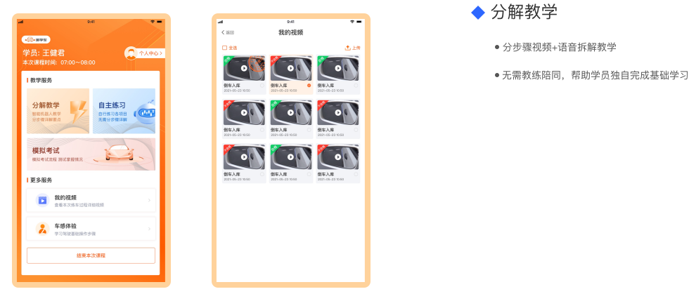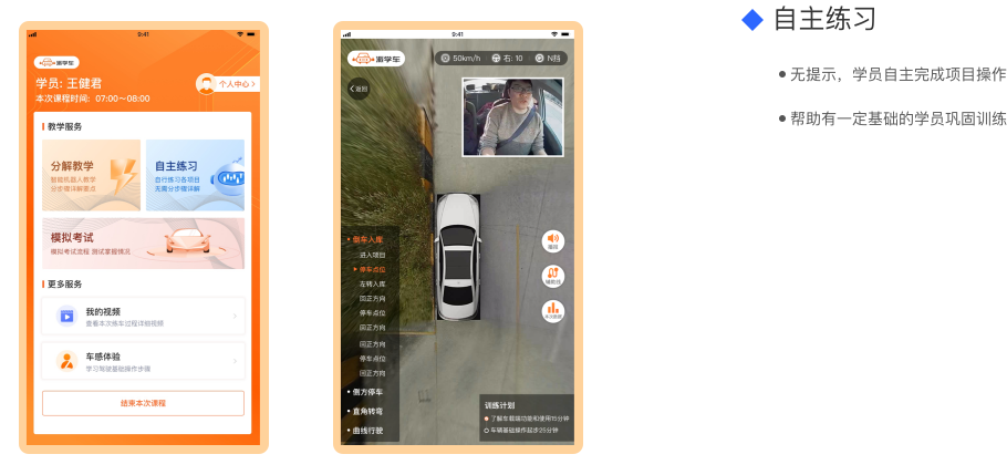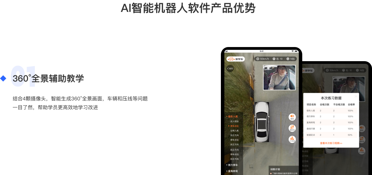 通过全⻋4颗摄像头,实时⽣成360°全景画⾯,帮助学员更好地掌握⻋身位置,理解操作点位